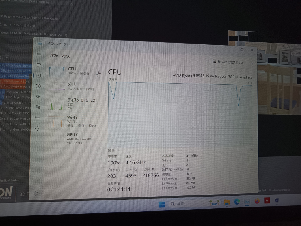 一方でGEEKOM A8についてはファンで冷やしてなくてもCBR23でCPU100%を維持することが可能でした。CPU温度は92度とミニPCとしては許容範囲の部類かもしれません。
