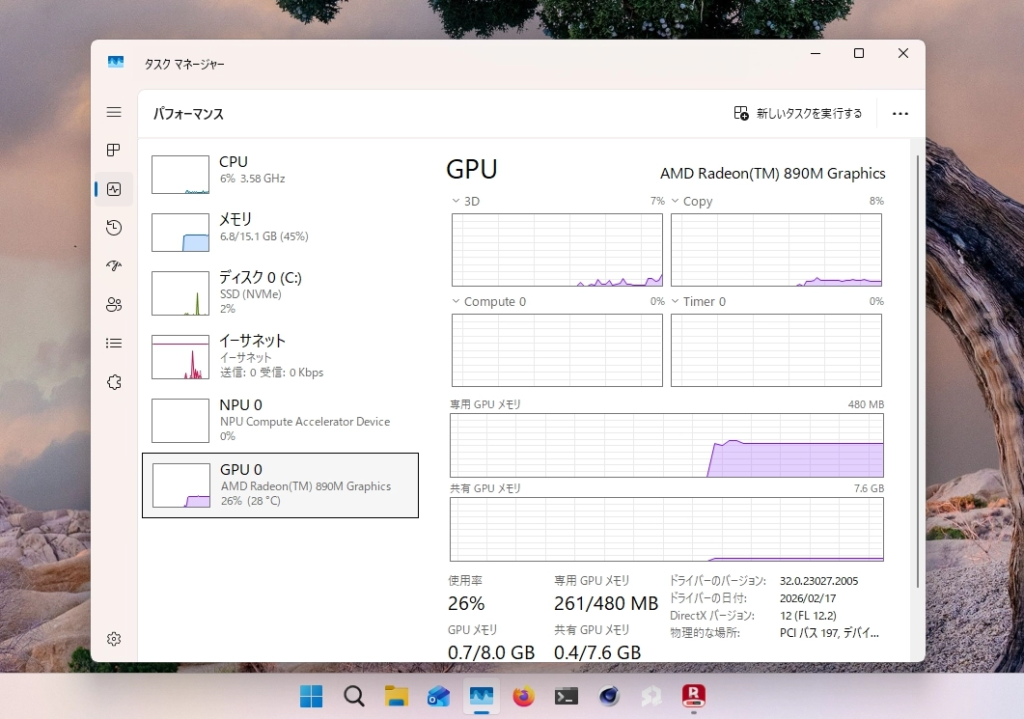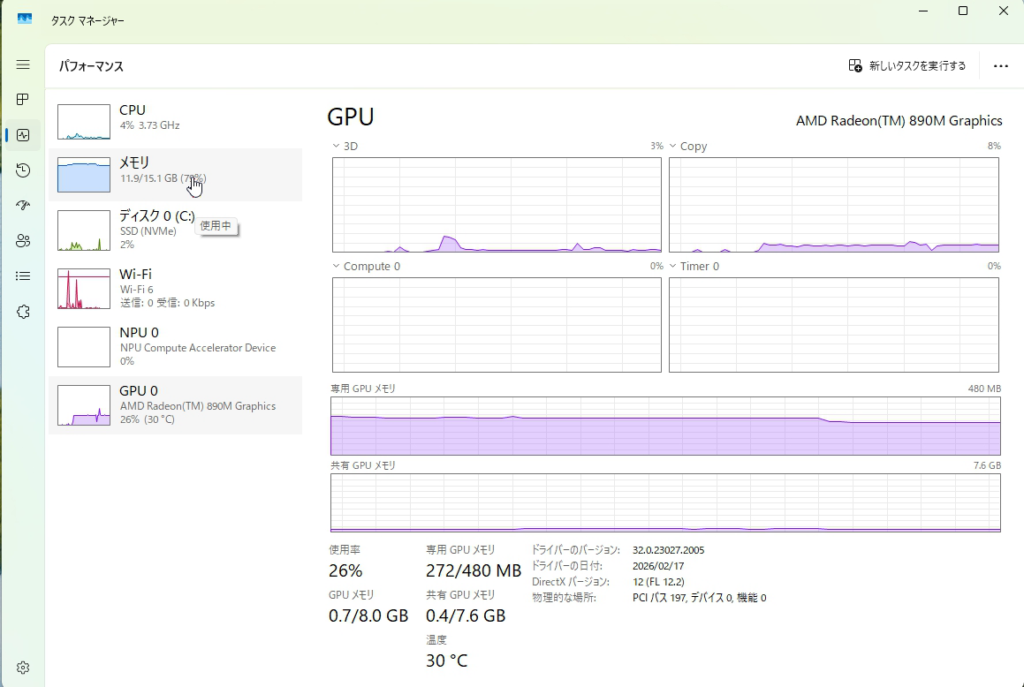 890Mで2560x1080の動きのない画面を録画した場合、Radeon 890M iGPUで大体26%ぐらいなので、内蔵GPUでも割と動くのではないかと思います。