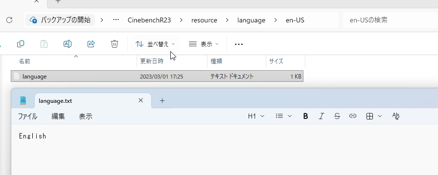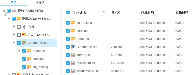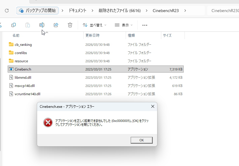 単に画像や動画を復旧させても良かったのですが、それでは芸がないなあとおもいまして、今回はCinebench R23のアプリフォルダ、数千個単位でファイルが入っているフォルダを外付けSSD上に転送してから消して、アプリが起動できるか試してみました。
